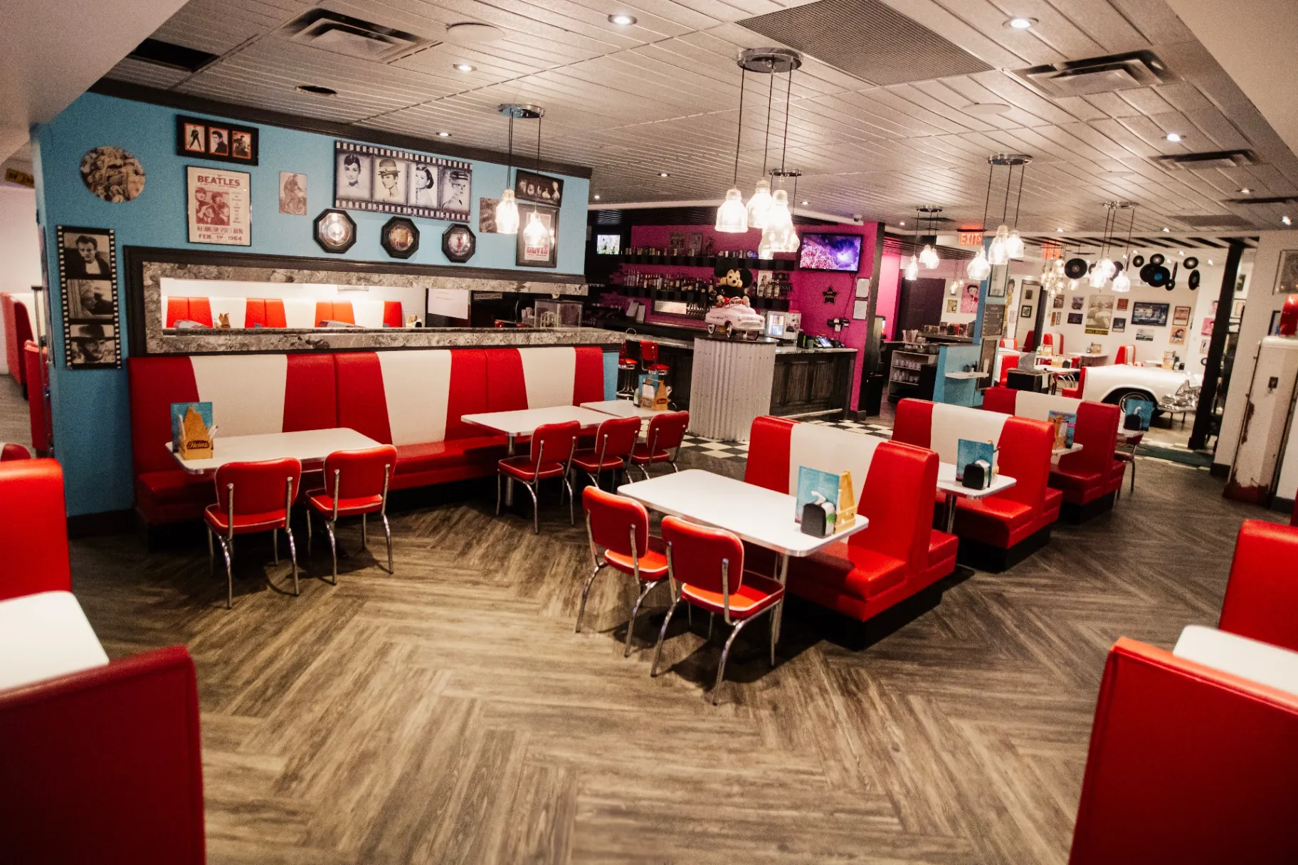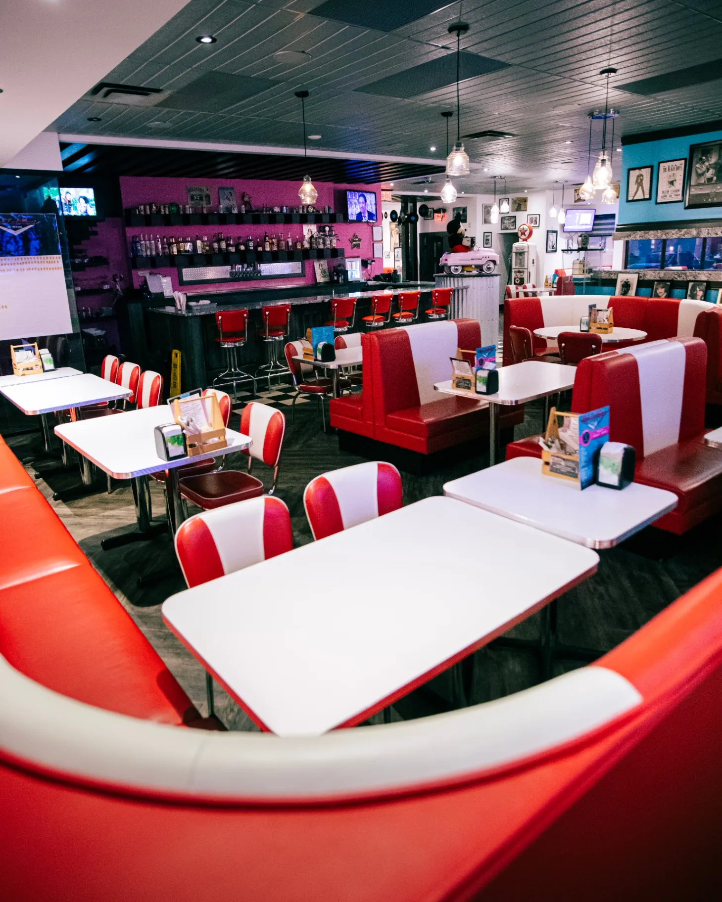 Pink Cadillacs is instantly recognizable — from our vintage car seating to our walls filled with Elvis, Looney Tunes, Marilyn Monroe, and the most iconic stars of the ’50s and ’60s.